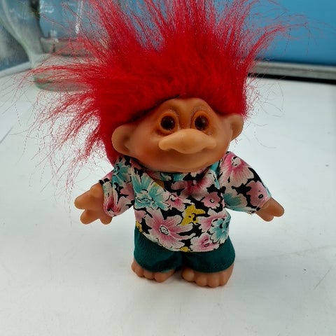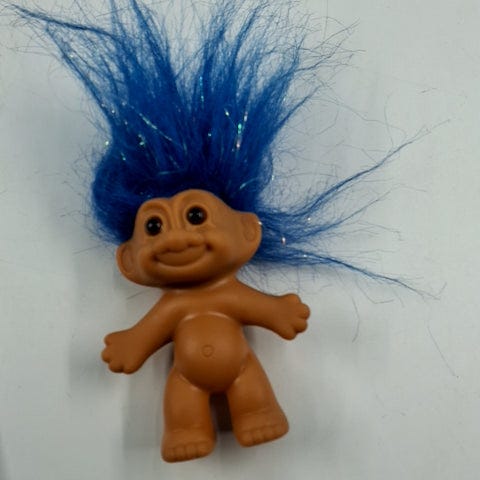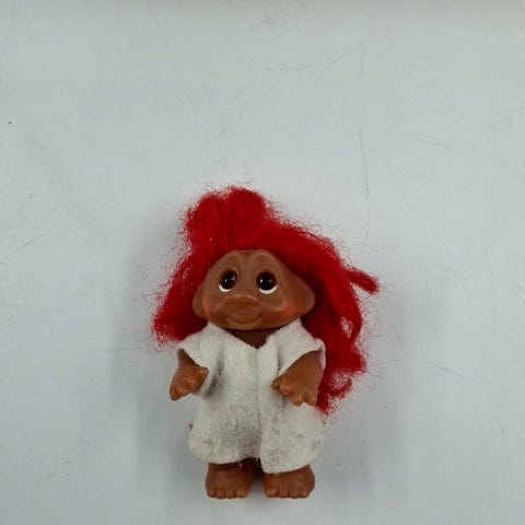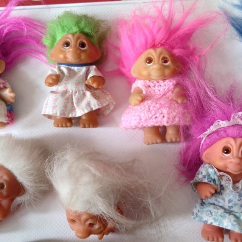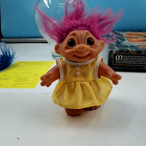 Figuren er en lille dukke med grønt hår og en lilla kjole.