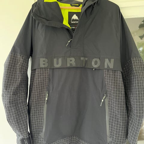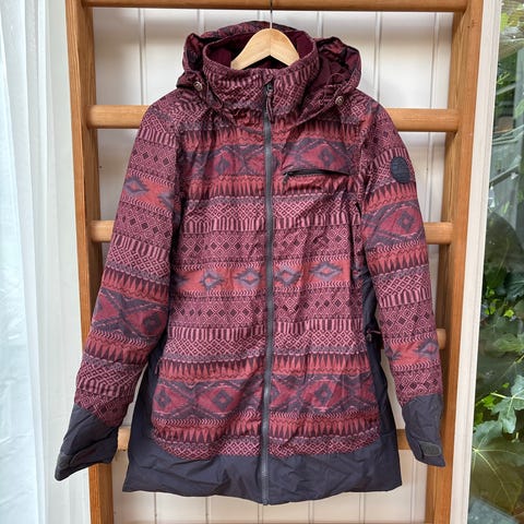 Burton Dame Jakke i størrelse S med mønstret design. Jakken har hætte og lynlås foran. Materialet og farven er tilpasset til sport og udendørs aktiviteter.
