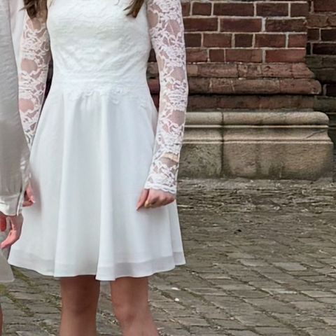 Rigtig smuk konfirmationskjole fra 2025. Brugt 1 dag - ny renset. Mange fine detaljer. Kjolen er str. 40 men svarer til en almindelig str. 38. Kan prøves i Nykøbing F.