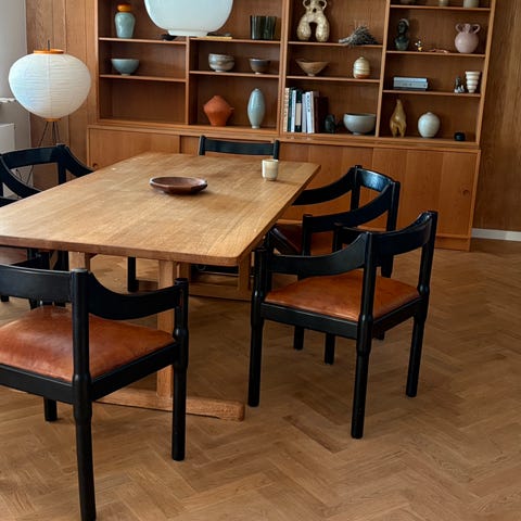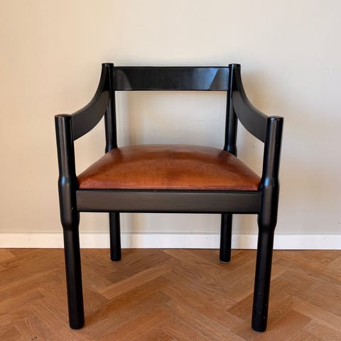 Vico Magistretti Dining Chair, 1960sGlossy black painted wood and original wicker seat Good vintage condition. The seat is in good condition. There is some general wear, marks, and scuffs consistent with its age. H75 x W50 x D45 cm / Seating: 43 cmVico Magistretti "Carimate" dining chair for Cassina. The "Carimate" chair is one of Vico Magistretti’s most famous chairs. Magistretti created this chair for the 'Club House of Carimate's Golf Club' restaurant. The chairs changed to four different manufacturers until Magistretti requested a patent for the construction in 1963. The "Carimate" chair is inspired by the tradition of countryside furniture and simple materials such as straw and wood.
