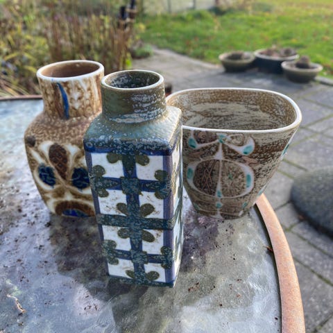 3 flotte vaser, og et fad.