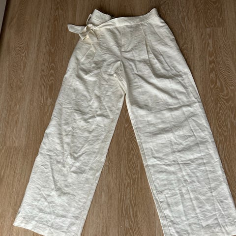 Zara Bukser i hvid farve, størrelse XL til kvinder. Bukserne har lynlåslommer foran samt en tætsiddende pasform. Materialet fremstår som blødt og let, egnet til daglig brug. Bukserne er nye og ubrugte - dog vasket.
