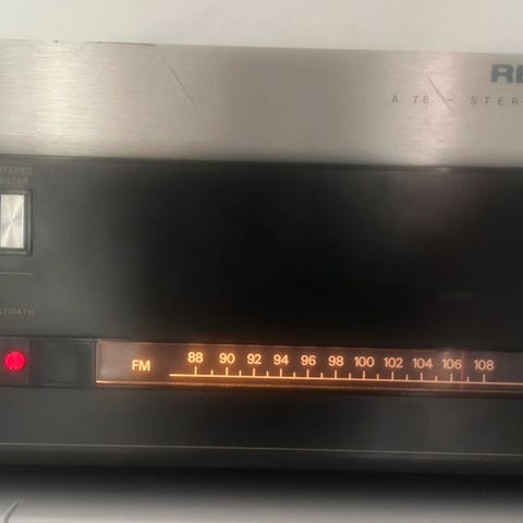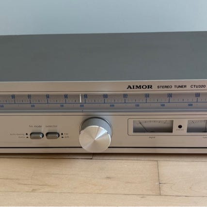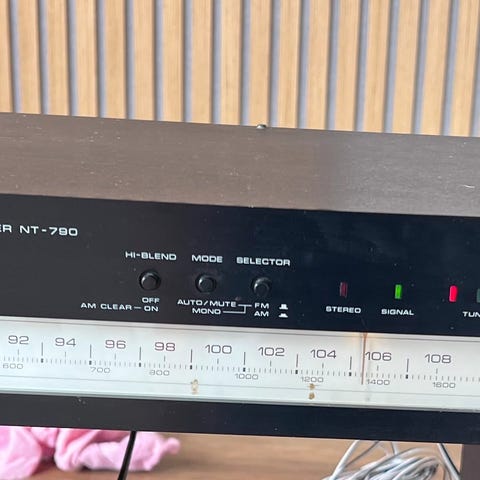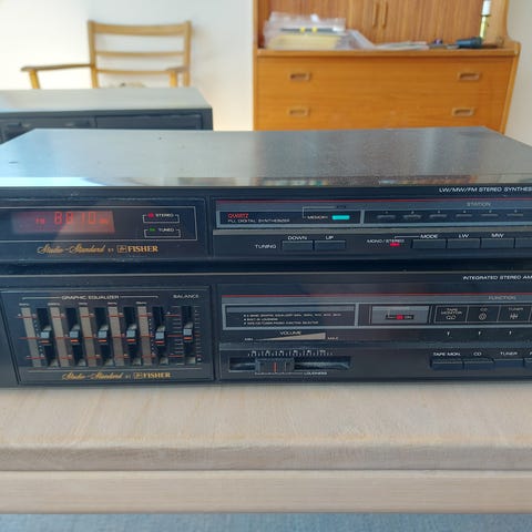 Fisher FM-1000 Stereo Tuner i sølvfarve. En vintage radio tuner med analoge knapper og drejeknap til justering af frekvens. Enheden har FM-stereo modtagelse med frekvensskala og tilslutningskabler bagpå til output og strøm. Velegnet til brug i lydanlæg til modtagelse af FM-radiokanaler.