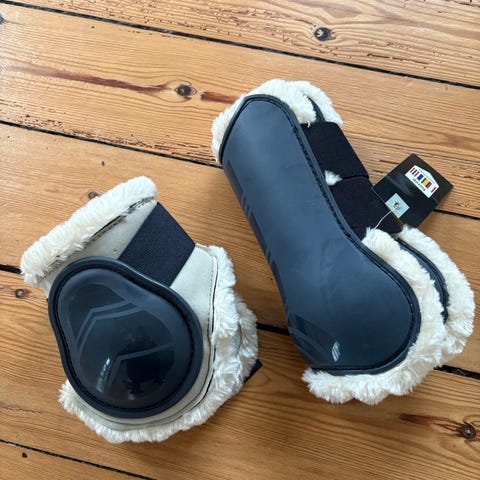 Farve: Hvid, der er desværre misfarver (rosa farvet) på forbens gamacherne, de har kun været prøvet på staldgangen samt bagbens gamacherne også kun prøvet på.