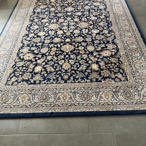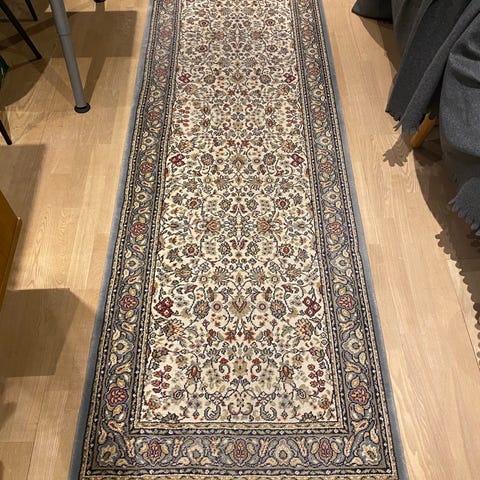 Tæppet har en beige farve med mønstrede detaljer i forskellige farver. Materialet og specifikke sammensætning fremgår ikke, men tæppet er egnet til brug i stuer eller andre boligområder.
