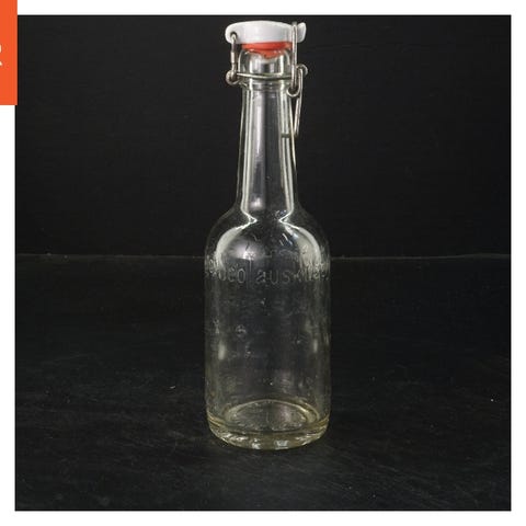En gennemsigtig flaske med en sort top og låg. Flasken har en kapacitet på ca. 30 cm i højden. Den er velegnet til opbevaring af væsker, og dens design gør den nem at hælde fra.