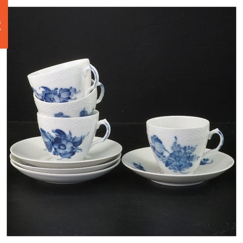 Sæt med fire kaffekopper med matchende underkopper af stellet Blå blomsr, design flettet. De er lavet af porcelæn og fra kgl porcelænsfabrik Underkoppernes diameter er 14,5 cm, mens koppens diameter er 8 cm.