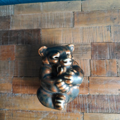 Denne figur forestiller en siddende bjørn med hænderne op til ansigtet, fremstillet i keramisk materiale. Figuren har en glat overflade med mørke jordfarvede toner og er 9 cm høj. Formen er detaljeret, viser bjorden med øjne, ører og klør, og den har en tekstur der fremhæver bjørnens træk med en kontrasterende lys farve på udvalgte områder.