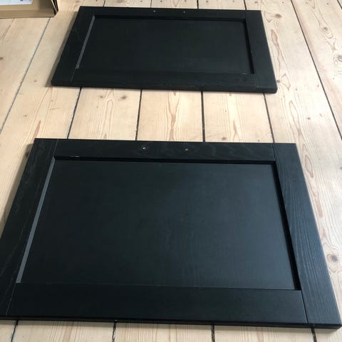 1 låge 40 cm. bred og 56 cm. høj. Den er slebet og klar til at blive malet.