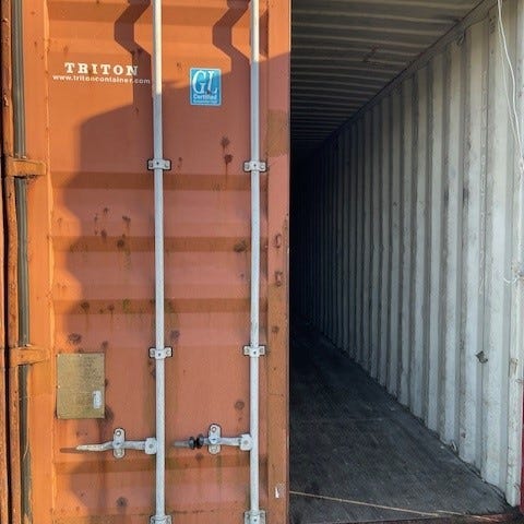 Brugt 40 fods container. High cube. Vind- og vandtæt. Der er monteret lys. Har buler og skrammer, men i god stand i forhold til alderen. Der er rust i dørene og pakninger i dørene er ødelagt. De går en smule stramt men det kan afhjælpes med lidt olie og fedt. Indv.længde 12,03 m. B 2,35m. x H2,39 m. x Dørhøjde 2,34 m. x Dørbredde 2,28 m.