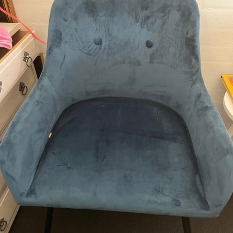 I Smuk petroleumsfarve.. Har ingen pletter eller lignende - på billedet er det velouren der vender lidt forskellige veje og så ser lidt lysere/mørkere ud.