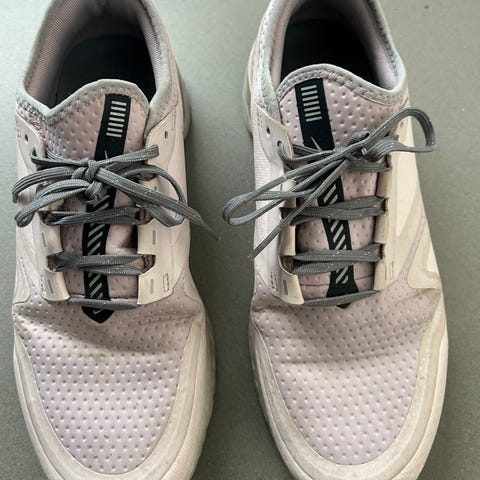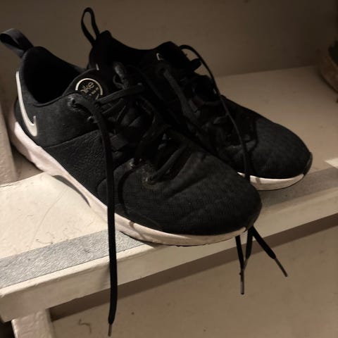 Nike løbesko i størrelse 42. Skoene er sorte med et orange Nike-logo og er designet til løb. Materialet er åndbart og velegnet til sportsbrug.