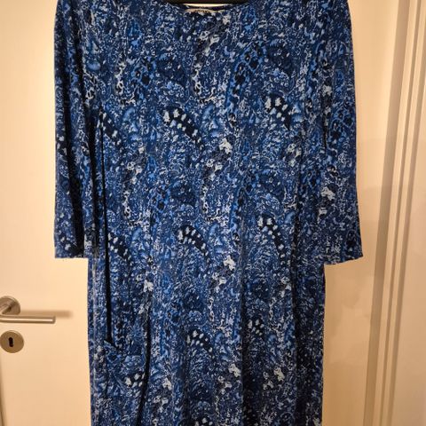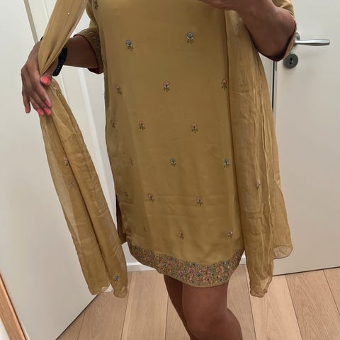 Lang indisk tunika M med spejle, broderier og lange slidser. Fra et sæt Salwar-kameez – jeg har ikke længere bukserne. Den ægte vare: Var med i rygsækken fra Indien i 1986. Jeg har næsten ikke brugt den, så den er i rigtig fin stand om end den nok trænger til en bedre stygning. Viscoseagtigt stof. Mørk blå. Bryst 50cm. Længde 107cm. Vejer 200g.