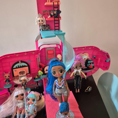 Bratz Campfire Van legetøj i blå og pink farver. Inkluderer en legetøjsvan med åbne døre og forskellige tilbehør såsom borde, stole og figurer. Egnet til rolleleg og samling for børn. Sælges samlet