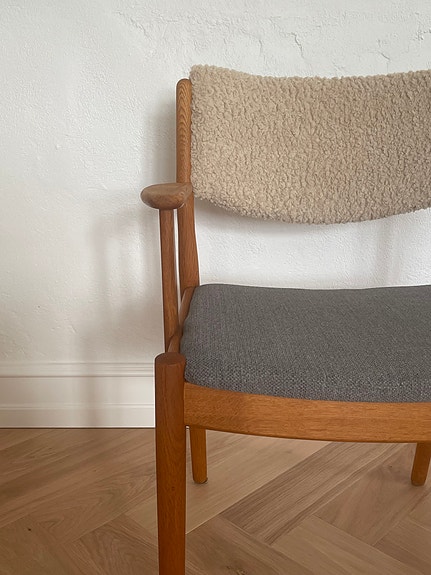 Armlæn - renoveret med nyt Kvadrat uld stof / skum på sæde, boucle på rygstykke.