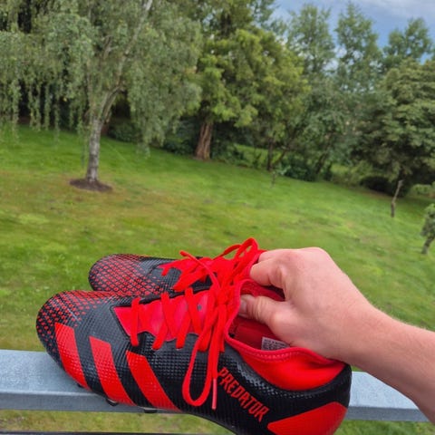 Adidas Predator fodboldstøvler i størrelse 45, farvet orange og sort. Fremstillet med materialer designet til fodboldspil, med knopper under sålen for optimal greb på græsunderlag. Produceret i Cambodja.