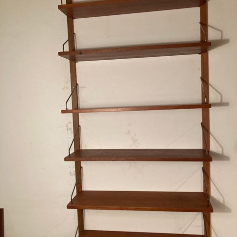 Poul Cadovius royal reolsystem reol i teak. Den ene bøjle “vender forkert”, men kan erstattes. Trænger til en kærlig hånd, prisen er sat derefter. Med to hylder og et skrivebord. Sidste billede er illustrativt, så man kan se, hvordan det hænger.
