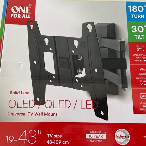 One For All full-motion universel TV-mount WM6252 med 15° tllt og op til 180° drejning er designet til at holde TV størrelsen 13-43" med en maksimal vægt på 25 kg. Dual-arm teknologien gør mounten velegnet til hjørner eller til at se fra et tilstødende lokale. Mounten er let at installere.