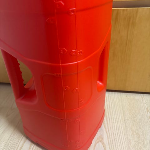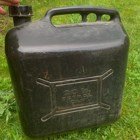 Metal benzindunk med en kapacitet på 20 liter. Dunkene er i forskellige farver, primært rød og grøn, og er velegnede til opbevaring og transport af benzin.