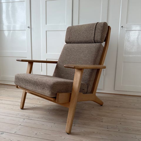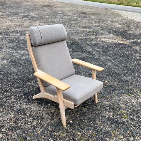 Flot klassisk lænestol af Wegner model ge290 i egetræ. Vi kan levere med renoveret springvandet eller nye koldskumshynder i forskellige farver og kvaliteter.