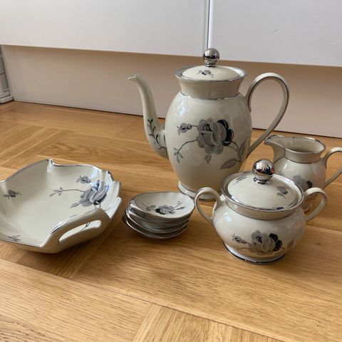Håndmalet med guldstaffering. Flasken ca. 15 cm. høj, og krukken ca. 10 cm. høj. Fin stand uden skår, dog er guldstaffering på krukken for oven lidt slidt (se det sidste billede).
