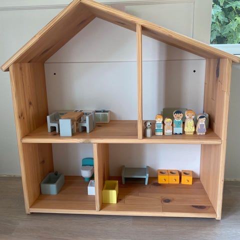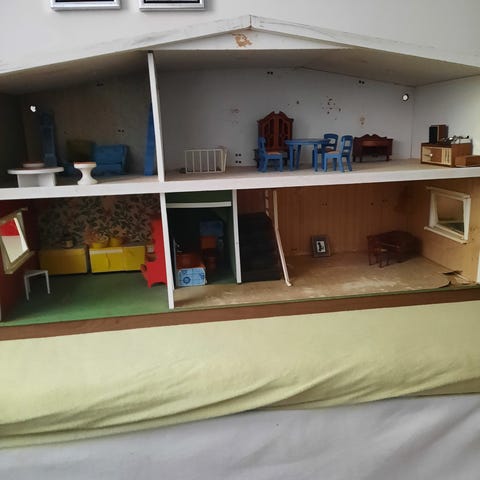 Dukkehus i to etasjer med flere rom, møblert med små møbler og figurer. Passer til lek og samling, laget i tre og annet materiale. Fargene inkluderer brunt, blått og rødt.