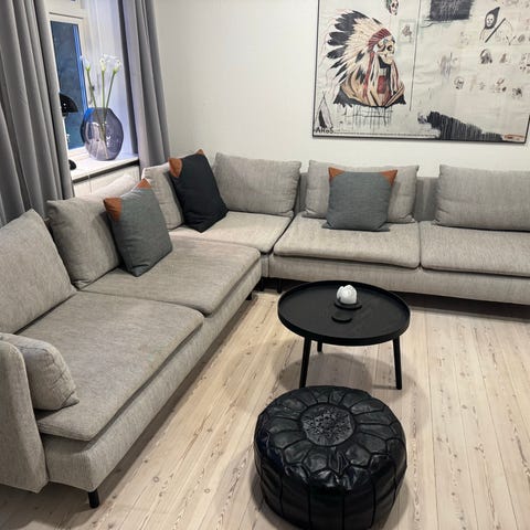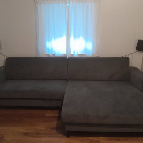 Koksgrå sofa (koldskum) med dobbelt chaiselong, samt el-recliner i modsatte side. Sædet med el, kan køres rimelig langt ud og er behagelig at ligge i. Sofaen har ingen brugstegn, da den har været brugt i lidt mindre end et års tid for ny og har ellers stået opbevaret.