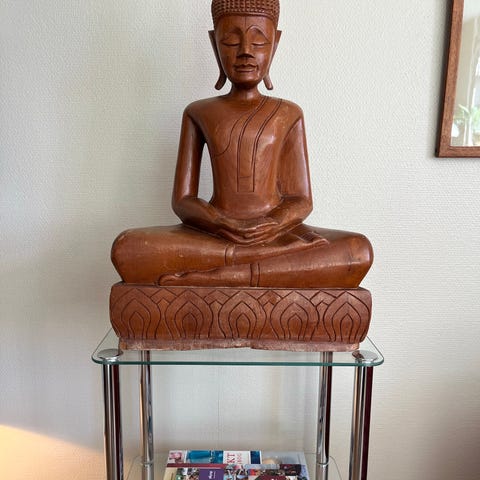 Buddha figur placeret i en ramme lavet af brun træ. Figuren er trekantet med detaljeret udskæring og hvidlig farve. Rammen har en sort baggrund, og produktet kan stå oprejst på en flad overflade. Egnet til dekorative formål.