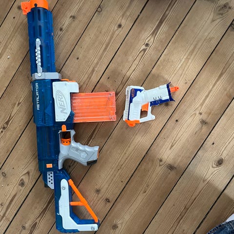 Nerf N-Strike Elite blastersæt bestående af en stor blaster og en lille pistol. Blasterne er fremstillet i plastik og har orange, blå og sorte detaljer. Sættet er designet til børn og bruges til leg og målskydning. Den er også automatisk.
