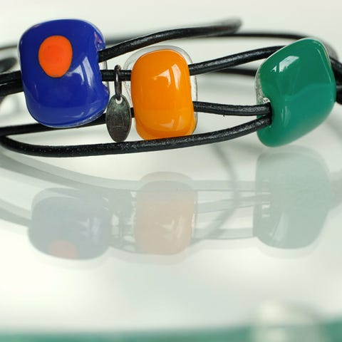 Billedet viser et håndlavet halssmykke i glas fra Mikkalina-Glas.