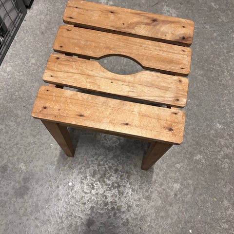 Taburet: Høj, hvid, metalstel og med træsæde.