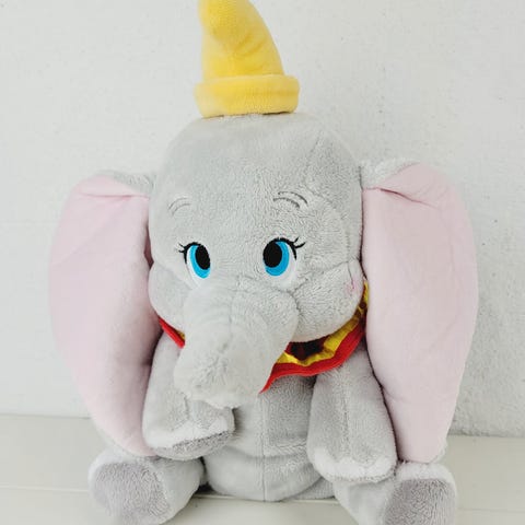 Disney Dumbo bamse legetøj i grå og lyserød farve. Fremstillet i blødt materiale, velegnet til børn. Bamsen forestiller den kendte elefantfigur Dumbo med store ører og rød hat.