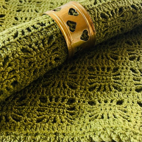 12 stk. pæne firkantede servietter hæklede i groft bomuldsgarn. Hvide med blå kant str. 19x19 cm.