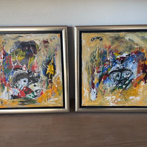 Maleri med abstrakt motiv i flere farver. Indeholder forskellige former og teksturer, udført med et ekspressivt og farverigt udtryk. Mål 100x80 cm.