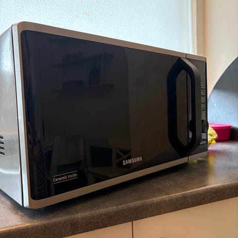 Samsung mikrobølgeovn i hvid farve med flere funktioner som automatisk optøning, grill, miniovern og forskellige madlavningsindstillinger. Enheden har en digital kontrolpanel med knapper til specifikke madtyper og tilberedningsmetoder.