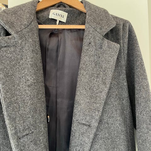 Ganni Frakke i sort farve, størrelse XS. Jakken er designet til kvinder og har en bæltefunktion. Materialet og indvendige detaljer fremgår af billederne.