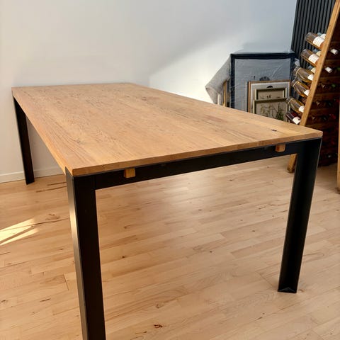 Vild eg gør det mere råt i looket, og har samtidig et flot sort jern stel. Det kan skilles ad, bordpladen er meget tung.