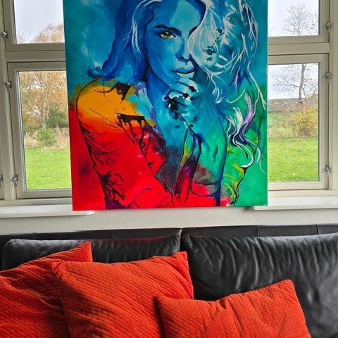 Malerierne måler henholdsvis 50x70 cm og 60x60 cm. De er mixed media, men hovedsageligt akryl.