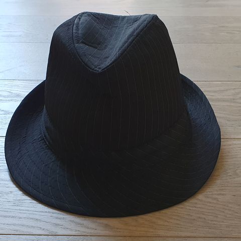 E. & A. Casse sort herre hat i størrelse M. Hatten er fremstillet i et materiale, der fremstår som filt eller lignende stof. Den har en klassisk cylinderform med en bred skygge og indvendig foring med mærketræk. Hatten kan anvendes til formelle lejligheder eller som en del af en kostume- eller vintage garderobe. Hatten er sammenklappelig. Udvendlig rigtig pæn, men indvendig trænger den til nyt stof.