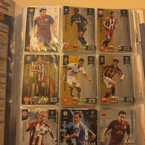 På billederne er alle de “skinnende kort” fra de respektive serier, i mapperne er der er en masse basecards, samt flere specielle kort, dog ikke de skinnende. Nogle mapper er mere fyldt end andre. Skriv pb for billeder af alle kortene, der er ca 250 billeder af sider.