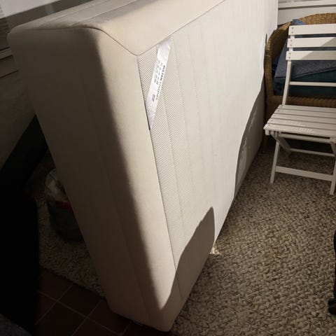 IKEA Sultan Skaland boxmadras i lys grå farve. Hallvandenmands. Runde metalben i rustfrit stål. Betrækket har specifikke vaskeanvisninger for vedligeholdelse. Betrækket er i gid stand men har en lys skjold på midten. Madrassen er egnet til soveværelse og tilbyder en enkel og funktionel sengeløsning.