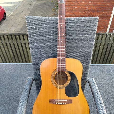 Den fremstår med lette brugsspor og skal have nye strenge, men konstruktionen er sund, og halsen er lige. Perfekt som restaureringsprojekt, samlerobjekt eller dekorativ vintageguitar med sjæl og historie.