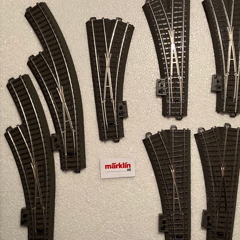 Samling af Märklin modeltogsskinner i metal, fremstillet i Vesttyskland.