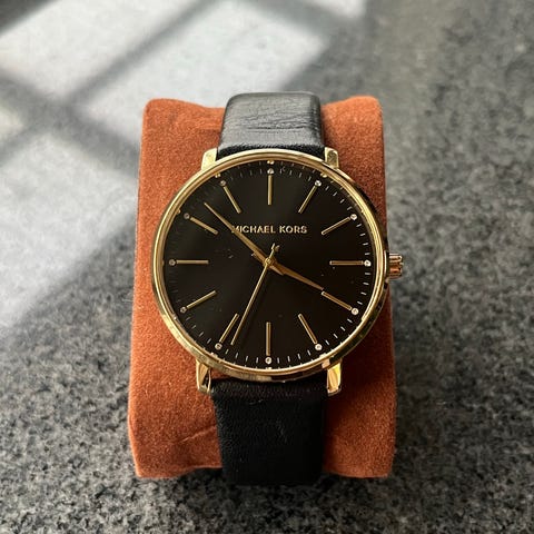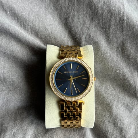 Michael Kors ur i guld og stainless steel. Med krystal kant rundt. Er brugt få gange, ingen ridser i glasset. Fremstår i virkelig god og flot stand. Er blevet passet på.