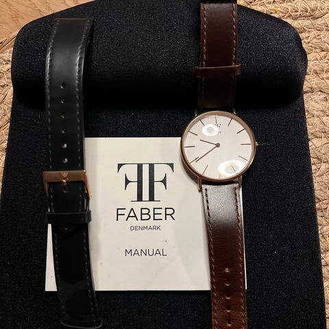 Helt nyt Faber ur til dame. Uden kasse eller kvittering. Aldrig brugt og virkelig flot. Brunt læder med rose gold detaljer.