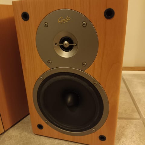 Gale, Gold Monitor højttalerne har en virkelig god lyd og kabinetter med smuk træ finish. Højttalerne har basrefleks bagud og diskant-horn på fronten. 15-100W. Står fuldstændig som nye!