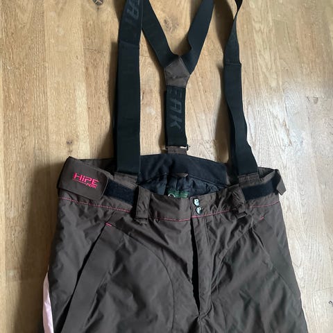 Peak Performance skibukser til kvinder i størrelse M. Bukserne er designet til sport og udendørsaktiviteter, lavet i pink materiale med justerbare sorte stropper for bedre pasform.