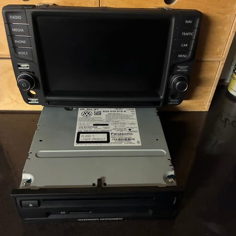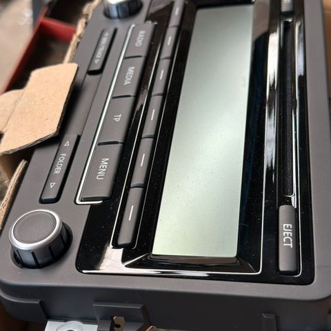 VW Standard bilradio med CD-afspiller og FM/AM radiofunktioner. Enheden har en digital skærm og knapper til CD, TP, FM, AM, menu og AS. Designet til brug i VW køretøjer.