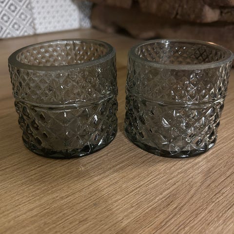 Billed 4-6: To fyrfade i klart glas med rødt skær, højde 5,5 cm, diameter 7,5 cm. 10 dkk pr. stk.