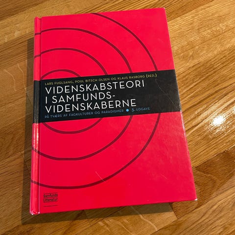 Videnskabsteori I Samfundsvidenskaberne er en bog med fokus på teori inden for samfundsvidenskaberne. Bogen har en rød omslag med cirkulære mønstre på forsiden. Den indeholder fagligt indhold om videnskabsteori, der kan anvendes til studier og forskning i samfundsvidenskabelige discipliner.